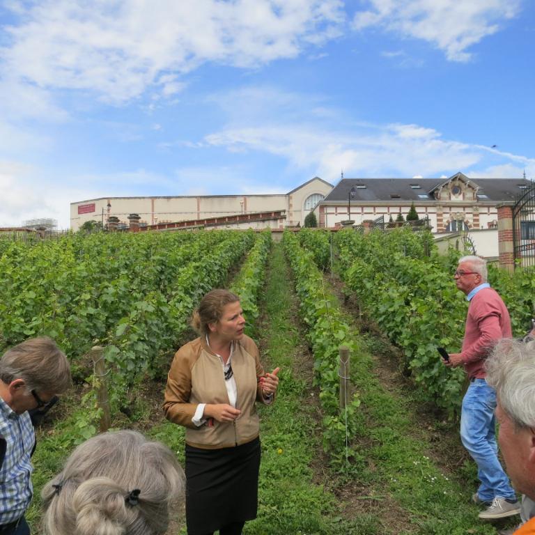 Bei Champagne Veuve Cliquot in Reims startete unsere Studienreise. Das Haus, früher unter dem Namen Veuve Cliquot Ponsardin bekannt, gehört zu den traditionsreichen Champagnerbetrieben, schließlich gibt es das Haus schon seit 1772. Heute gehört es zur LVHM-Gruppe. Veuve Cliquot verfügt über 24 km Kelleranlagen, die man in der Champagne in den Muschelkalk gegraben hatte und sie als "Les Crayers" bezeichnet. Die Crayers von Veuve Cliquot werden zu den schönsten der Champagne gezählt. Sie sind sehr sorgfältig gepflegt. Und im Hause gibt es einen besonders schönen Brauch: Langjährige Mitarbeiterinnen und Mitarbeiter werden geehrt, indem ein Kellergang mit ihrem Namen auf Straßenschildern bezeichnet wird. Eine solche Ehrung wird immer im Rahmen einer feierlichen Gangtaufe mit wichtigen Gästen vorgenommen. Zum ersten Mal hörten wir, welch großer Aufwand in der Herstellung von Champagner betrieben werden muß, bis das perlende Getränk ins Glas rollen kann. Dazu gehört auch die jahrelange Lagerung bis ein Champagner in den Verkauf gelangt. Zum Abschluß der charmanten Führung durch eine Luxemburgerin, die in jungen Jahren in der Schweiz gelebt hatte und ein sympathisches Gemisch von "Letzeburgisch", Schweizerdeutsch und Französisch sprach, gab es natürlich die Verkostung des weißen Veuve Cliquot.
