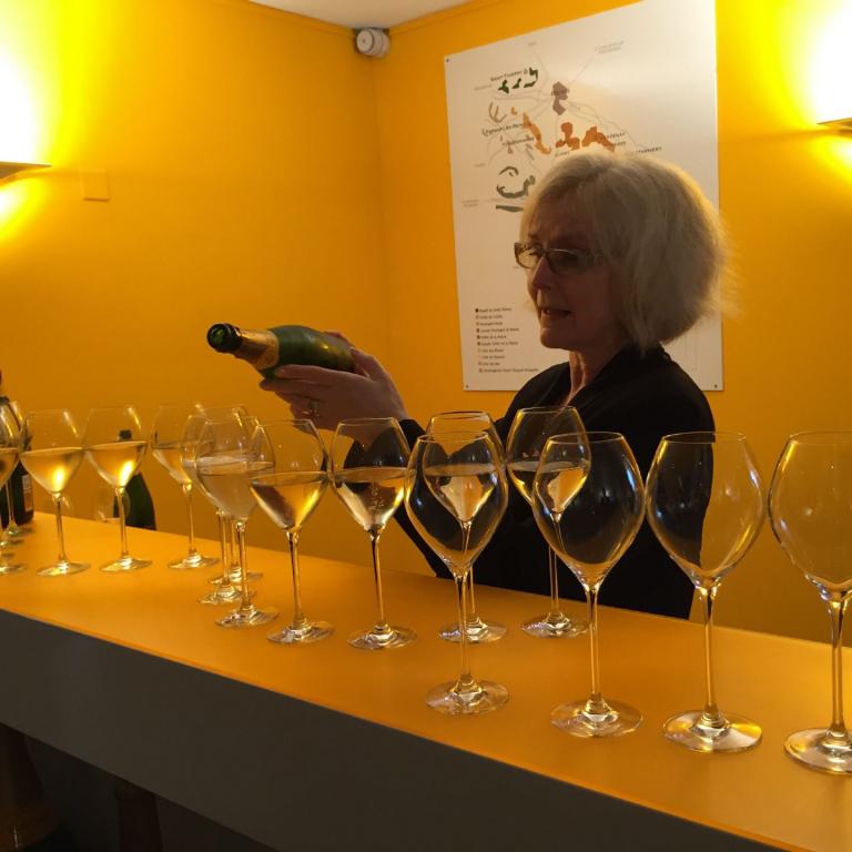 Am Vormittag besuchten wir Élise Déchannes in Les Riceys. Déchannes hat ein bißchen Kultwinzerinnen-Status, was sie auf sympathische Art mit ihren Präsentationen, ihrem charmanten Verkaufslokal und ihrem Biokonzept pflegt. Allein die Anzahl Kartons, die bei Élise eingekauft wurde, ist ein Beleg dafür, daß ihre Schäumer von sehr guter Qualität sind. Zudem bietet auch dieses kleinere Haus eine breite Palette von Champagnern an. Denn Champagner ist ein vielfältigerer Wein, als man gerne und gemeinhin so annimmt. So gibt es bei Déchannes neben einem normalen weißen Champagner auch einen Blanc de Blancs, einen raffinierten Rosé und auch einen Jahrgangschampagner.