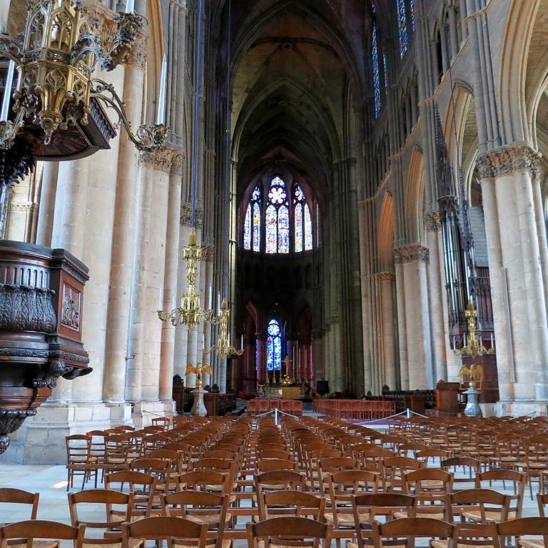Anschließend stand wie immer auf unseren Reisen ein kultureller Höhepunkt auf dem Programm. Eine kompetente, deutschsprechende Dame führte uns durch die Kathedrale von Reims. Diese prächtige gotische Kathedrale war Zeuge von Jahrhunderten französischer Geschichte. Über 600 Jahre war sie die Krönungskirche für alle französischen Könige. Wie die Stadt Reims wurde auch die Kathedrale in drei Kriegen sehr in Mitleidenschaft gezogen: 1870/1871 im preußisch-französischen Krieg, dann im 1. und auch im 2. Weltkrieg. In dieser Kathedrale hat Frankreich und die Welt vom großen Staatsmann Charles de Gaulle Abschied genommen.