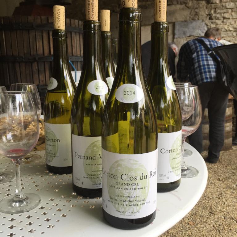 Nach einer weiteren petite collation eine hübsche französische Umschreibung für eine kleine Mahlzeit, deren Zweck es eben ist, daß wieder alles zusammenklebt und für ein paar Stunden hält schritten wir zur letzten und ganz großen Prüfung. Wir wurden in der kleinen Domaine Michel Voarick in Aloxe-Corton erwartet. Voarick gehört seit Jahren zu den Spitzenwinzern im Burgund. Hier gibt es eine Köstlichkeit nach der andern. Und wir hatten das Glück, die ganze Leiter hinauf degustieren zu können. Es endete dann in der weißen Linie mit dem Corton Charlemagne als Höhepunkt. Dieser köstliche Tropfen zählt zu den allerbesten Chardonnay im Burgund. Und bei den Roten bildete der Corton Clos du Roi den Abschluß. Auch hier ein absoluter Spitzenwein im Burgund ein wahrhaftig königlicher Burgunder.